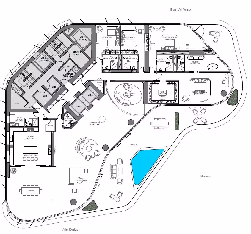 - شقة واحدة في كل طابق مع تراسات واسعة ومسابح خاصة.